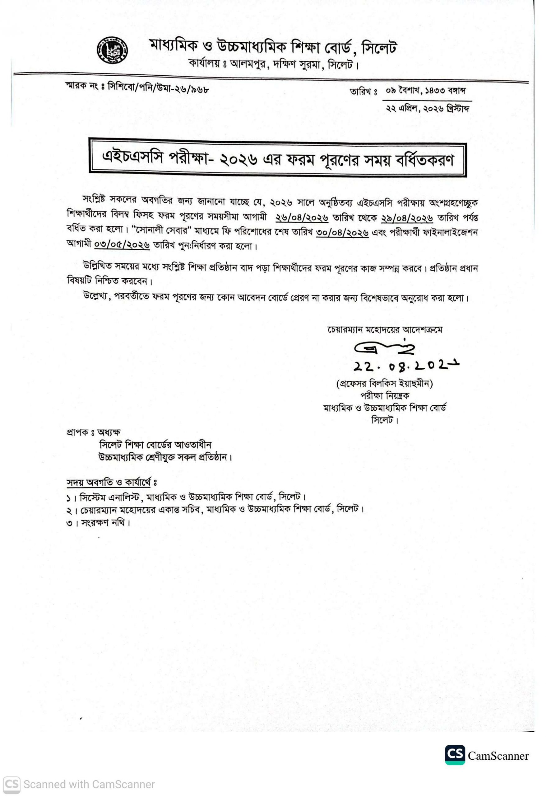 এইচএসসি পরীক্ষা ২০২৬ এর ফরমপূরণের সর্বশেষ বিজ্ঞপ্তি