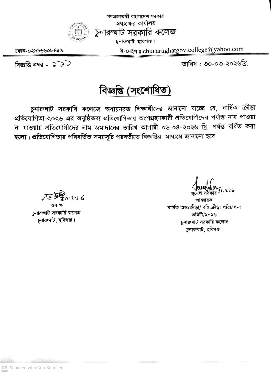 বার্ষিক ক্রীড়া প্রতিযোগিতার নাম জমাদানের সময় বৃদ্ধি