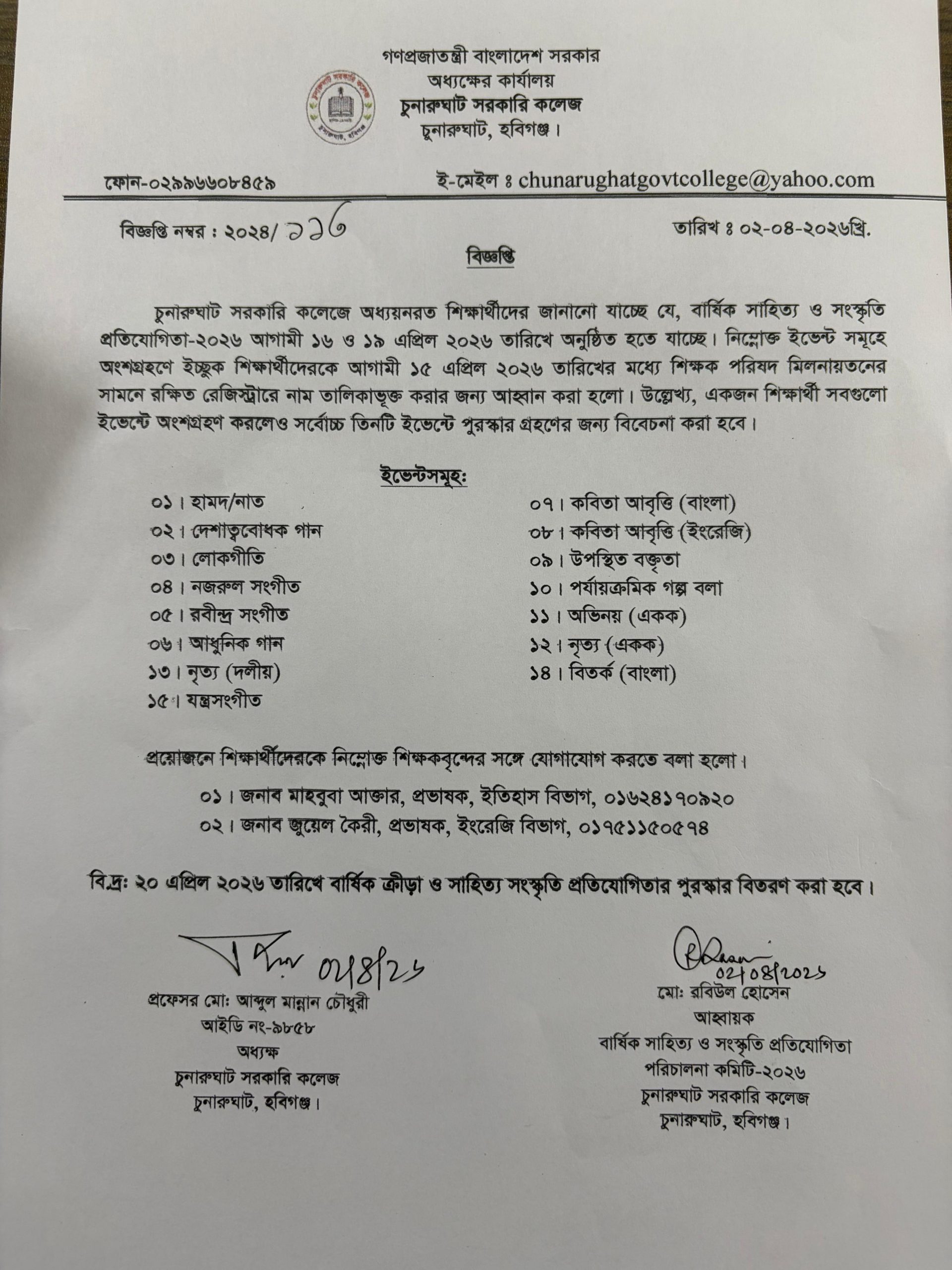 বার্ষিক সাহিত্য ও সাংস্কৃতিক প্রতিযোগিতার সময়সূচি ও প্রতিযোগিতায় নাম জমাদানের বিজ্ঞপ্তি