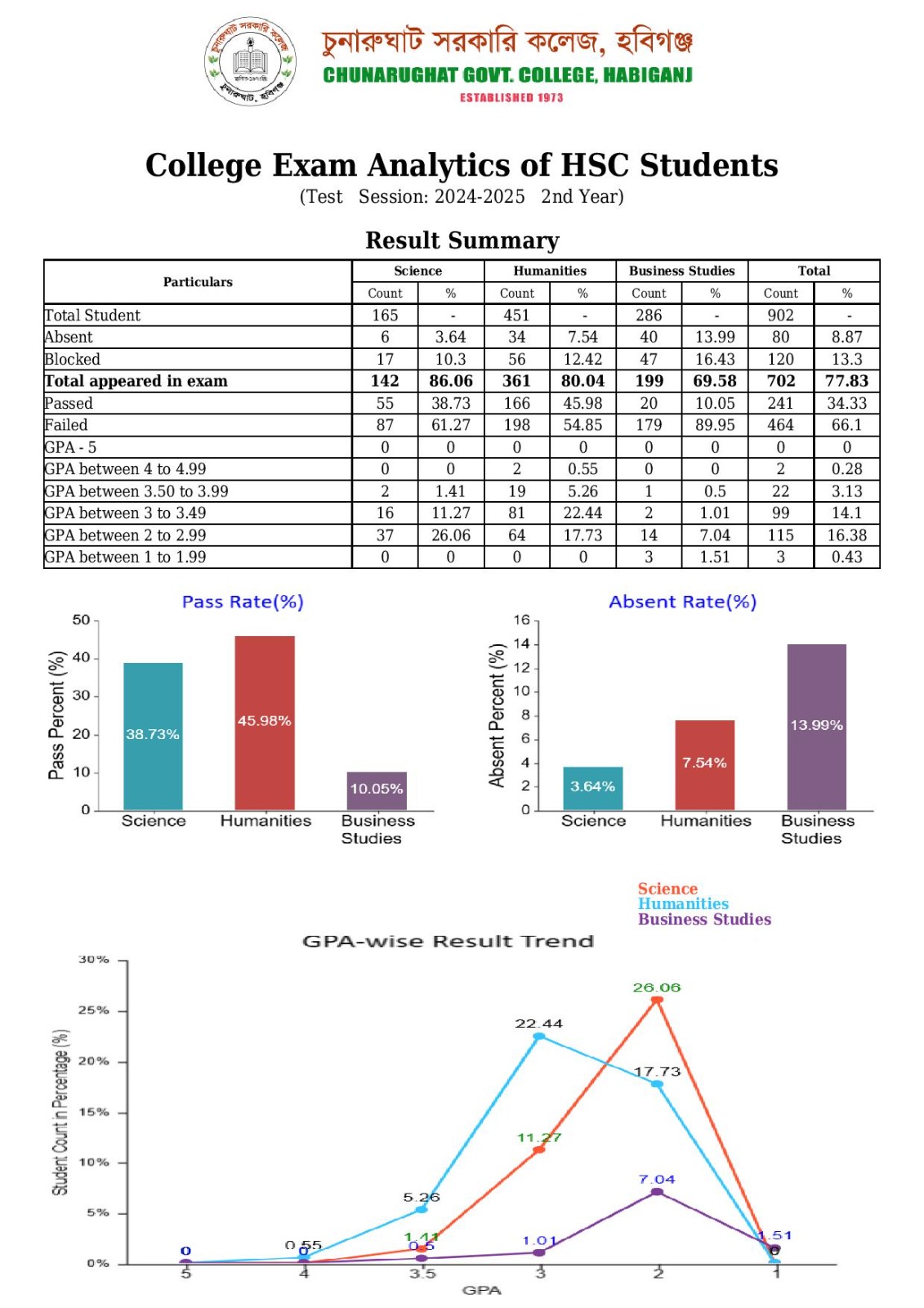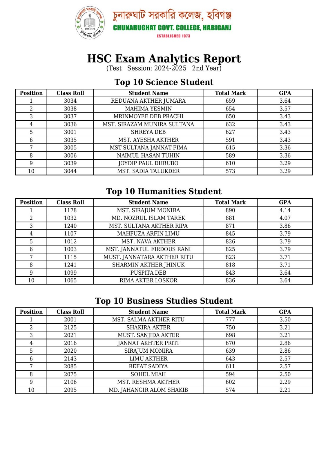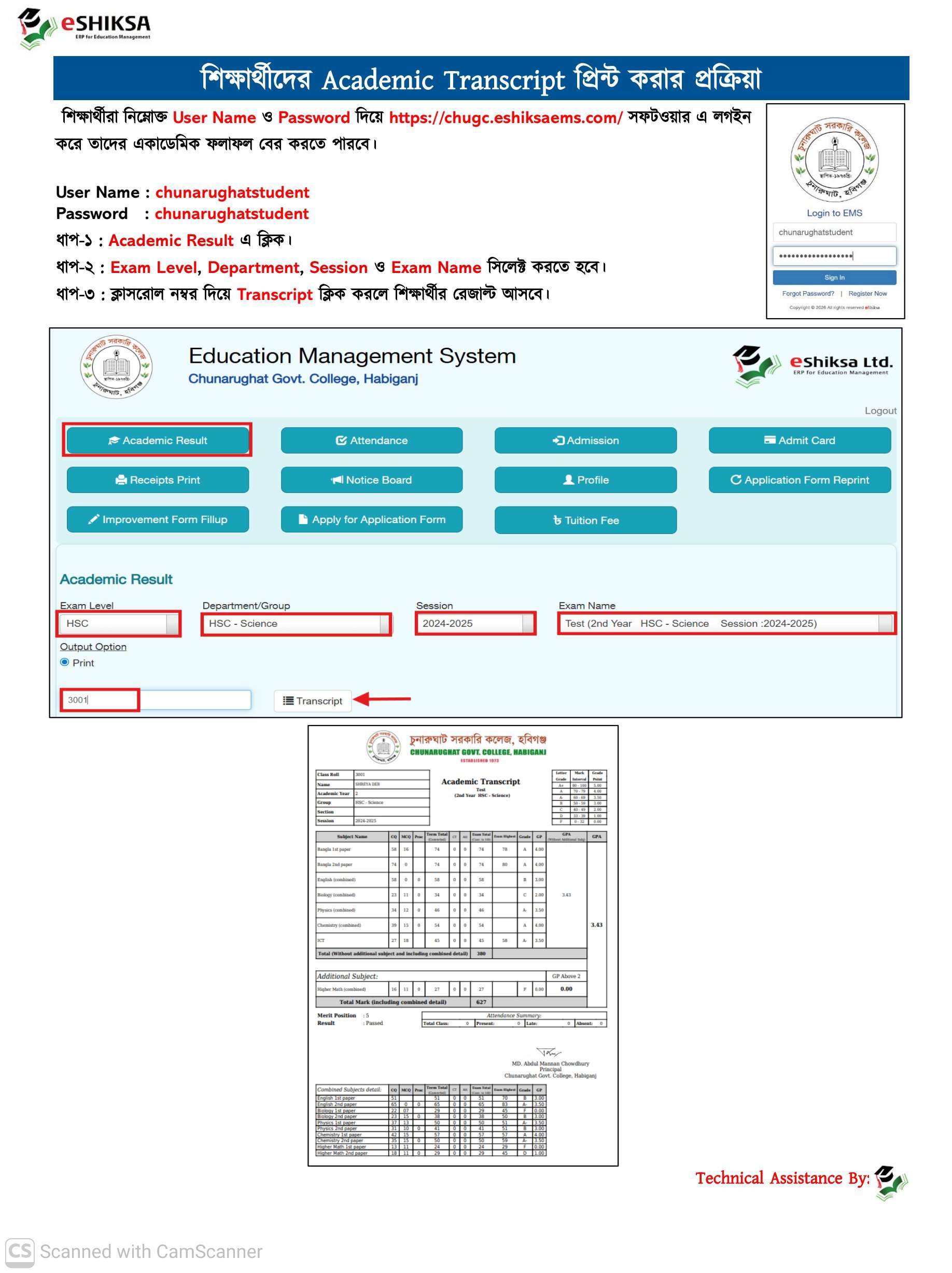 শিক্ষার্থীরা নিজের ফলাফল দেখতে https://chugc.eshiksaems.com/main লিঙ্কে ক্লিক করো। তারপর User ID :chunarughatstudent ও Password : chunarughatstudent দিয়ে Log in করে Academic Result এ ক্লিক করো। তারপর পর্যায়ক্রমে Exam Level HSC, Department Science /Humanities/Business Studies, Exam Name: Test Exam সিলেক্ট করে রোল নম্বরের ঘরে নিজের রোল নম্বর টাইপ করে Transcript বাটন চাপলে বিস্তারিত রেজাল্ট দেখা যাবে।