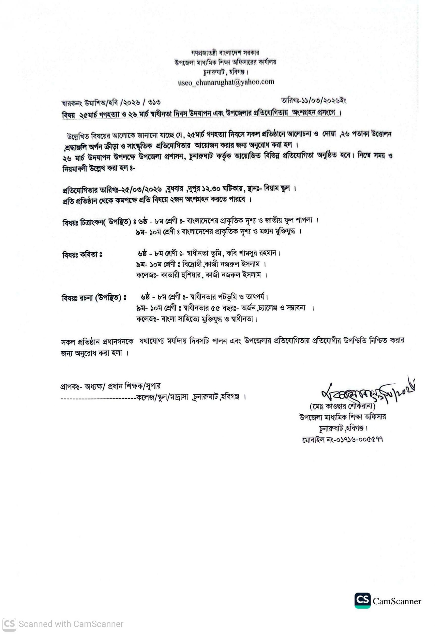 ২৫ মার্চ ও ২৬ মার্চ উপলক্ষে উপজেলার কবিতা আবৃত্তি ও উপস্থিত রচনা প্রতিযোগিতার জন্য ইচ্ছুক শিক্ষার্থীদের নাম, রোল, শ্রেণি 01773710796 নম্বরে হোয়াটসঅ্যাপ মেসেজের মাধ্যমে প্রেরণ করা ও বিয়াম স্কুলে ২৫ মার্চ তারিখ দুপুর ১২:৩০ এর মধ্যে উপস্থিত থাকার জন্য বলা হলো।